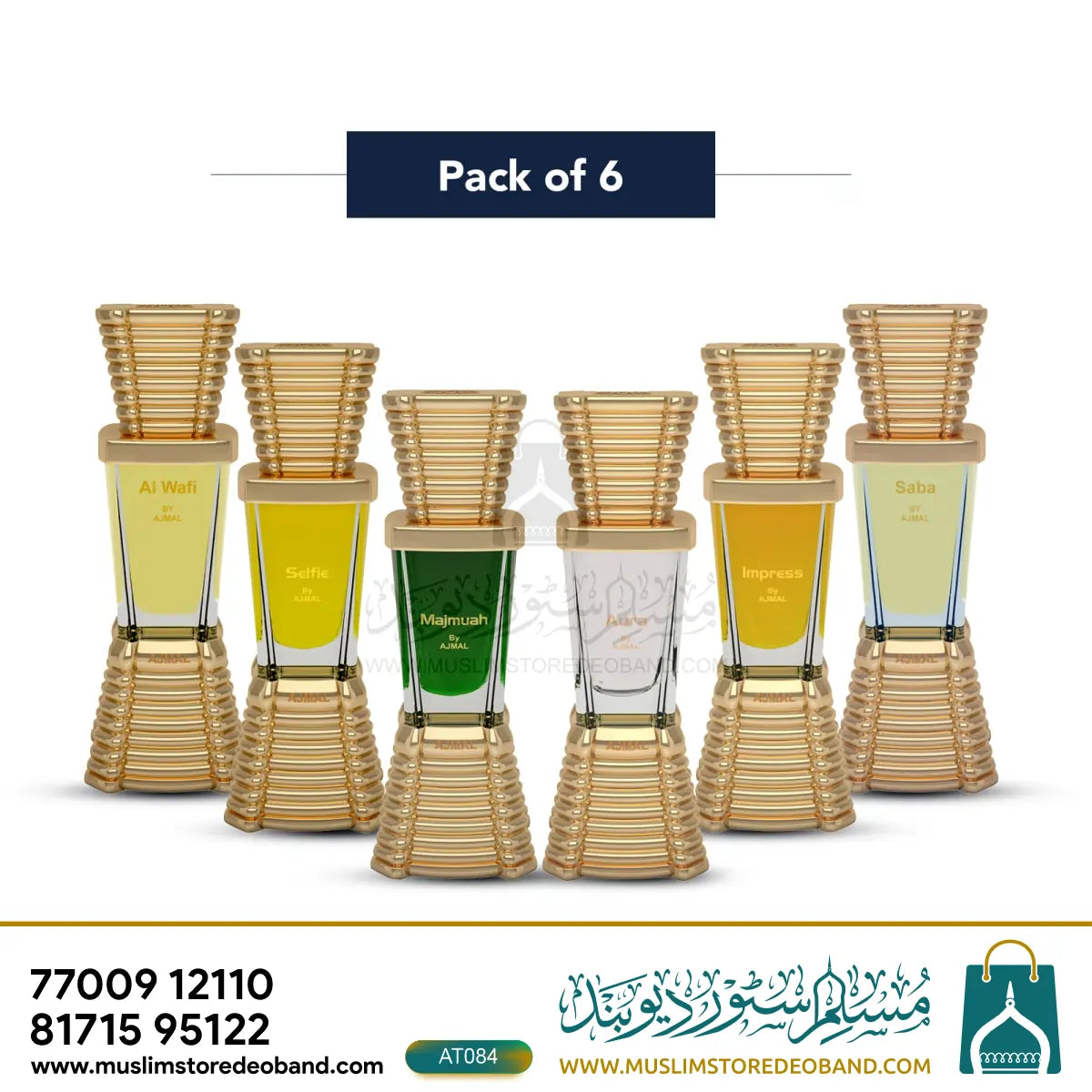 This pack of 6 attars brings together a variety of enchanting fragrances in stunning glass bottles with elegant golden caps.