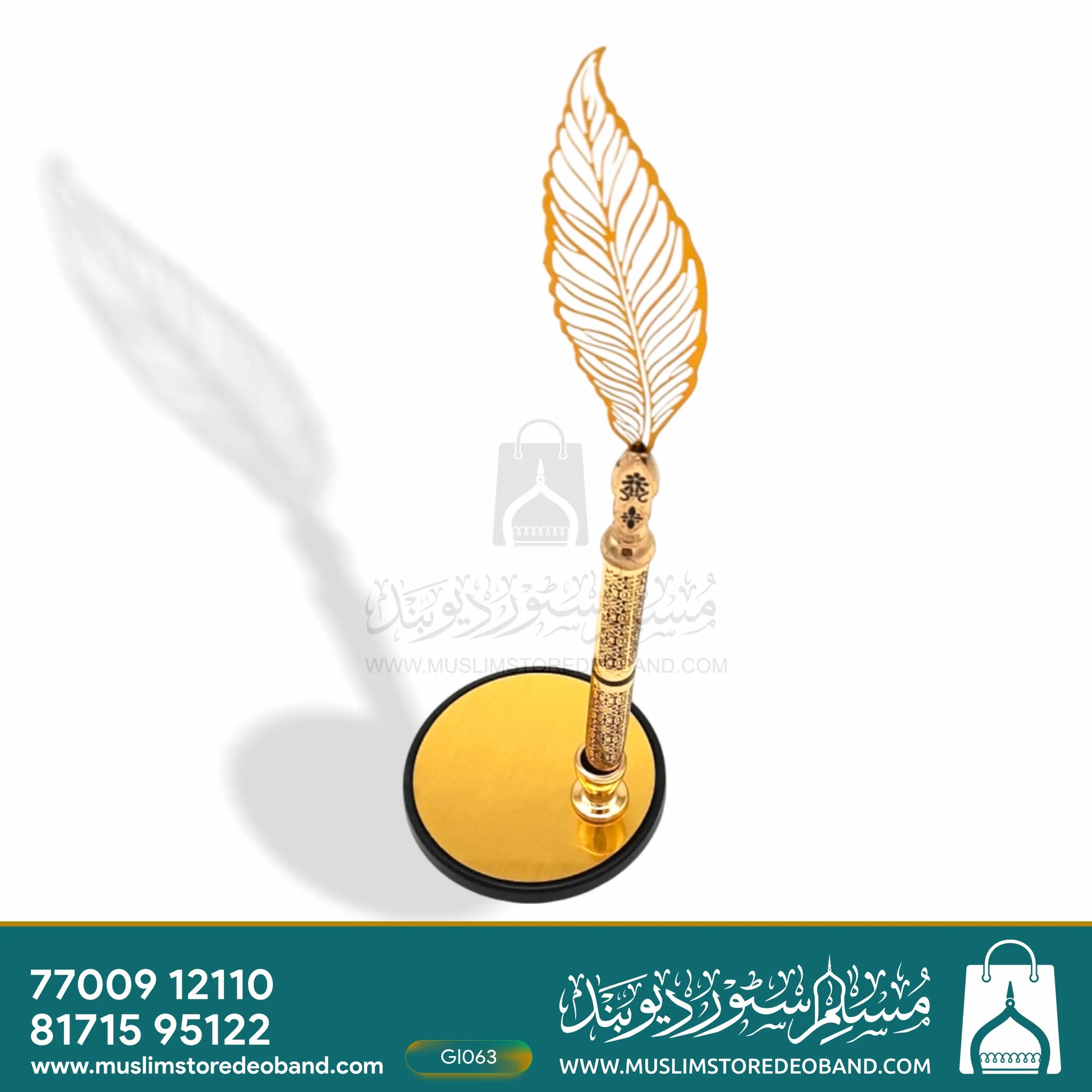 یہ ایک نفیس قلم ہولڈر ہے جو خوبصورت پر نما قلم اور سنہری بیس کے ساتھ تیار کیا گیا ہے۔ اسے تحفہ، اعزاز یا ڈیسک ڈیکوریشن کے طور پر استعمال کیا جا سکتا ہے۔